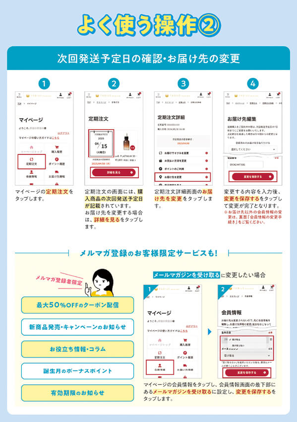 メニュー画面の「定期注文」よりご契約中の「定期注文詳細」からご変更が可能です。