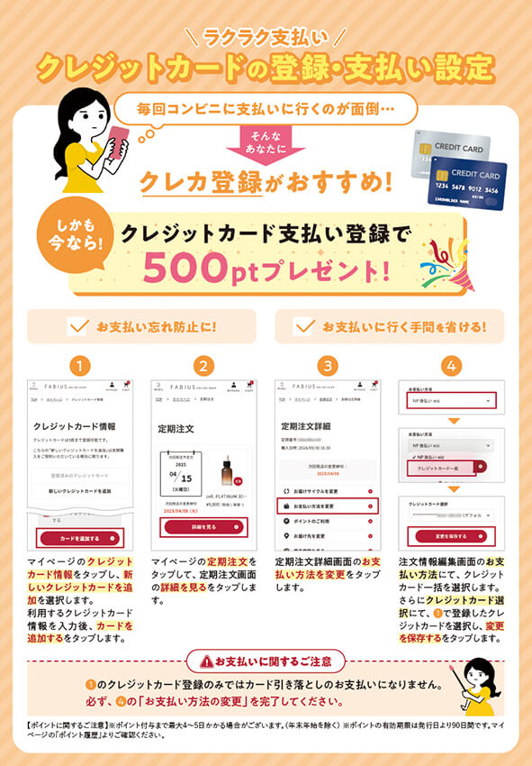 メニュー画面の「クレジットカード情報」よりご登録後、上記のとおりお手続きください。