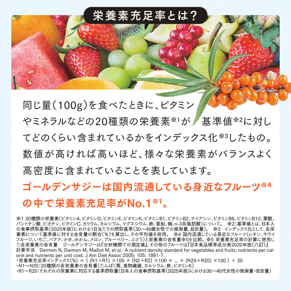 「栄養素充足率」とは、同じ量(100g)を食べたときに、ビタミンやミネラルなどの20種類の栄養素*6が基準値*7に対してどのくらい含まれているかをインデックス化*8したもの。数値が高ければ高いほど、様々な栄養素がバランスよく高密度に含まれていることを表しています。ゴールデンサジーは国内流通している身近なフルーツ*9の中で栄養素充足率がTOPクラス。